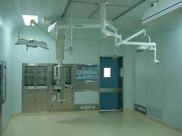至四层护士站吊镀锌龙骨6厘埃特板面煽灰油白色乳胶漆;二至四层洁净区内,除了手术室及高危分娩室、卫生间、淋浴室外均吊50mm玻镁彩钢板天花吊顶,墙面与天花连接
